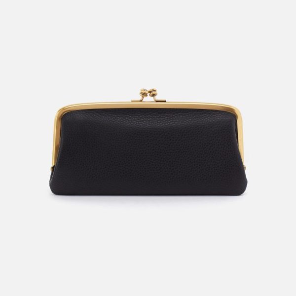 This large frame wallet doubles as a clutch thanks to the leather wristlet strap.